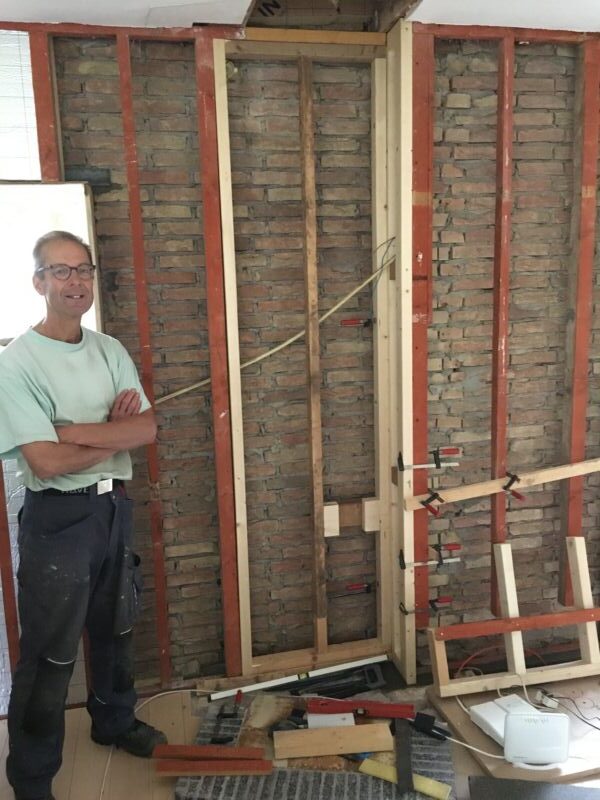 De operatie leverde ook een minder aangename verrassing op. ‘Een deel van de houten constructie bleek verrot, door optrekkend vocht uit de kruipruimte. De spleet die dat veroorzaakte sluit ik nu af en ik vernieuw het rotte deel.’ En passant heeft hij ook een oude schoorsteen verwijderd. Een hele renovatie dus! Marjo: ‘Het is een behoorlijke klus, en ingrijpend omdat we hier ook wonen. Het werk vereist aandacht, tijd, geduld en bovenal toewijding. Maar ik weet waarvoor ik het doe. Een grote kwaliteitsverbetering van onze woning!’