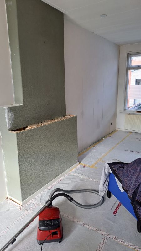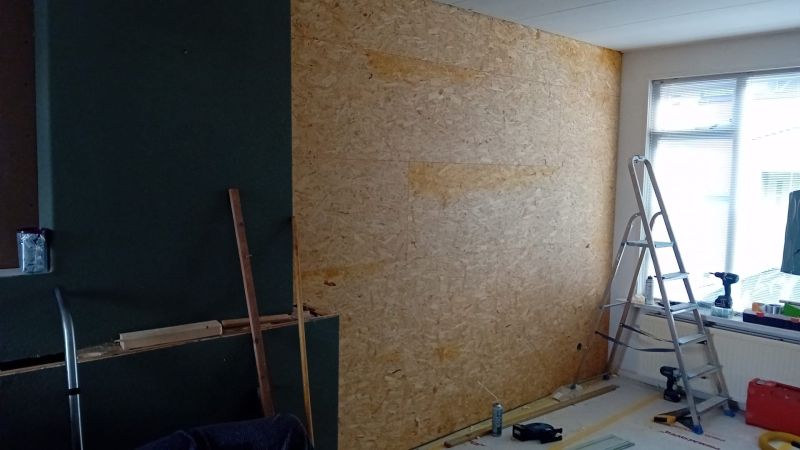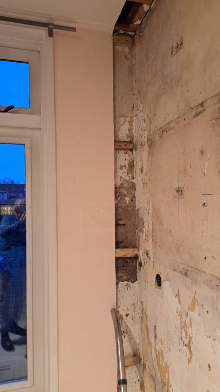‘De muur in de woonkamer is van binnenuit geïsoleerd, met een isolatielaag van zeker 10 centimeter. Daarna is de wand weer netjes gestuct. Vervolgens is de vloer geïsoleerd met isolatieschuim, maar pas nádat ik eerst krachtstroom heb laten aanleggen. Want een vriend van me zei: “Als je ooit elektrisch wilt gaan, moet je nu die krachtstroom aanleggen, anders kun je er straks niet meer bij. De ramen boven zijn ook vervangen, en hebben nu HR++-glas.’