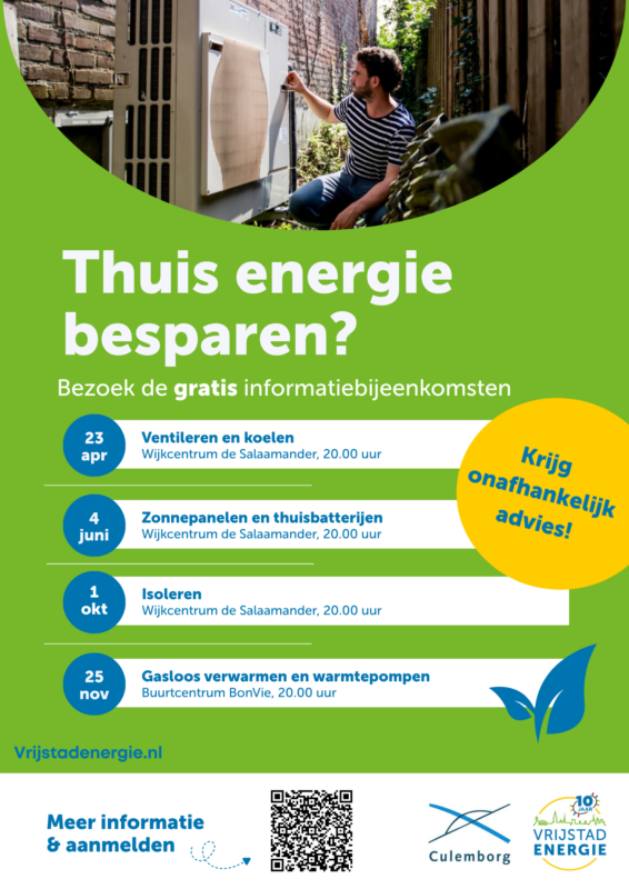 Ook in 2026 organiseert Vrijstad Energie vier informatieavonden over energiebesparing in huis. Elke avond heeft een eigen thema. Je krijgt onafhankelijk advies, een helder overzicht van de mogelijkheden voor besparing en handige tips van energieadviseurs Jori Velthoven en Steven Hulst. Deze avonden worden aangeboden door de gemeente Culemborg, dus het kost je niets!